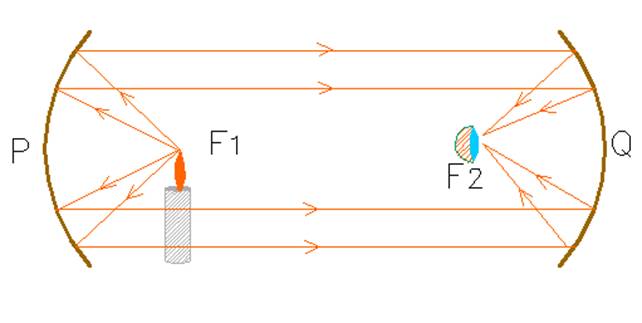 nel fuoco del primo mettiamo una lampadina, nel fuoco dell'altro un piattino con un po' di carta.